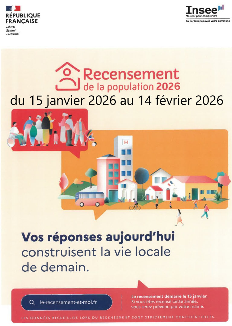 A compter du 15 janvier 2026 les trois agents recenseurs commenceront leur tournée auprès de chaque foyer pour y déposer dans toutes les boîtes aux lettres les fiches du recensement avec une notice explicative.